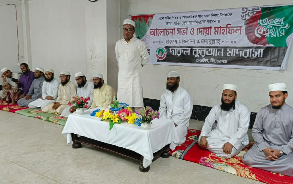 দারুল কুরআন মাদরাসায় ভাষা দিবসের আলোচনা সভা ও দোয়া মাহফিল কিশোরগঞ্জের তাড়াইল উপজেলা সদরের দারুল কুরআন মাদরাসার উদ্যোগে মহান শহিদ ও আন্তর্জাতিক মাতৃভাষা দিবস উপলক্ষে (২১ ফেব্রুয়ারি) শনিবার সকাল ১০টায় খান ব্রাদার্স কমার্শিয়াল কমপ্লেক্সে (৪র্থ তলা) মাদরাসা ক্যাম্পাসে ভাষা শহিদদের মাগফিরাত কামনায় খতমে কুরআন, আলোচনা সভা ও দোয়া মাহফিল অনুষ্ঠিত হয়েছে। দারুল কুরআন মাদরাসার প্রতিষ্ঠাতা… Continue reading দারুল কুরআন মাদরাসায় ভাষা দিবসের আলোচনা সভা ও দোয়া মাহফিল
