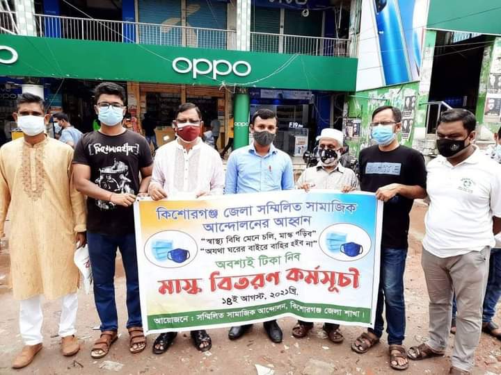 কিশোরগঞ্জ জেলা সম্মিলিত সামাজিক আন্দোলন করোনা ভাইরাস প্রতিরোধ ও সচেতনতামূলক কার্যক্রমের অংশ হিসেবে মাস্ক ও লিফলেট বিতরণ করেছে।