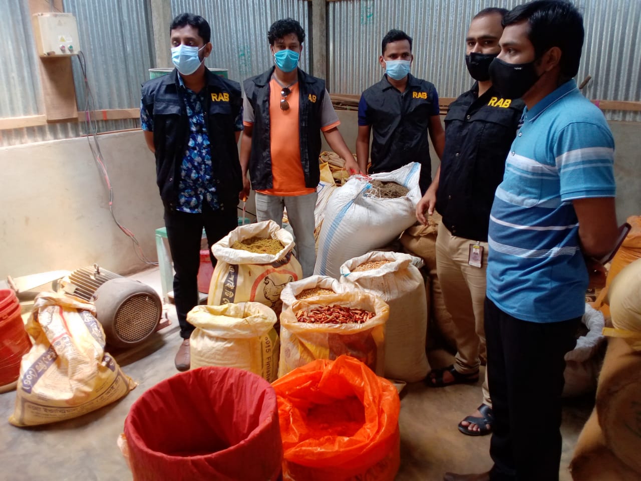 সেখানে মিলমালিক রুবেল মিয়া তিন মাস ধরে ভুষি, পাউডার, কাঠের গুড়া, ইন্ডাস্ট্রিয়াল কালার ও আগাছা মিশিয়ে ধনে, হলুদ ও মরিচের গুড়া উৎপাদন করে আসছিল।