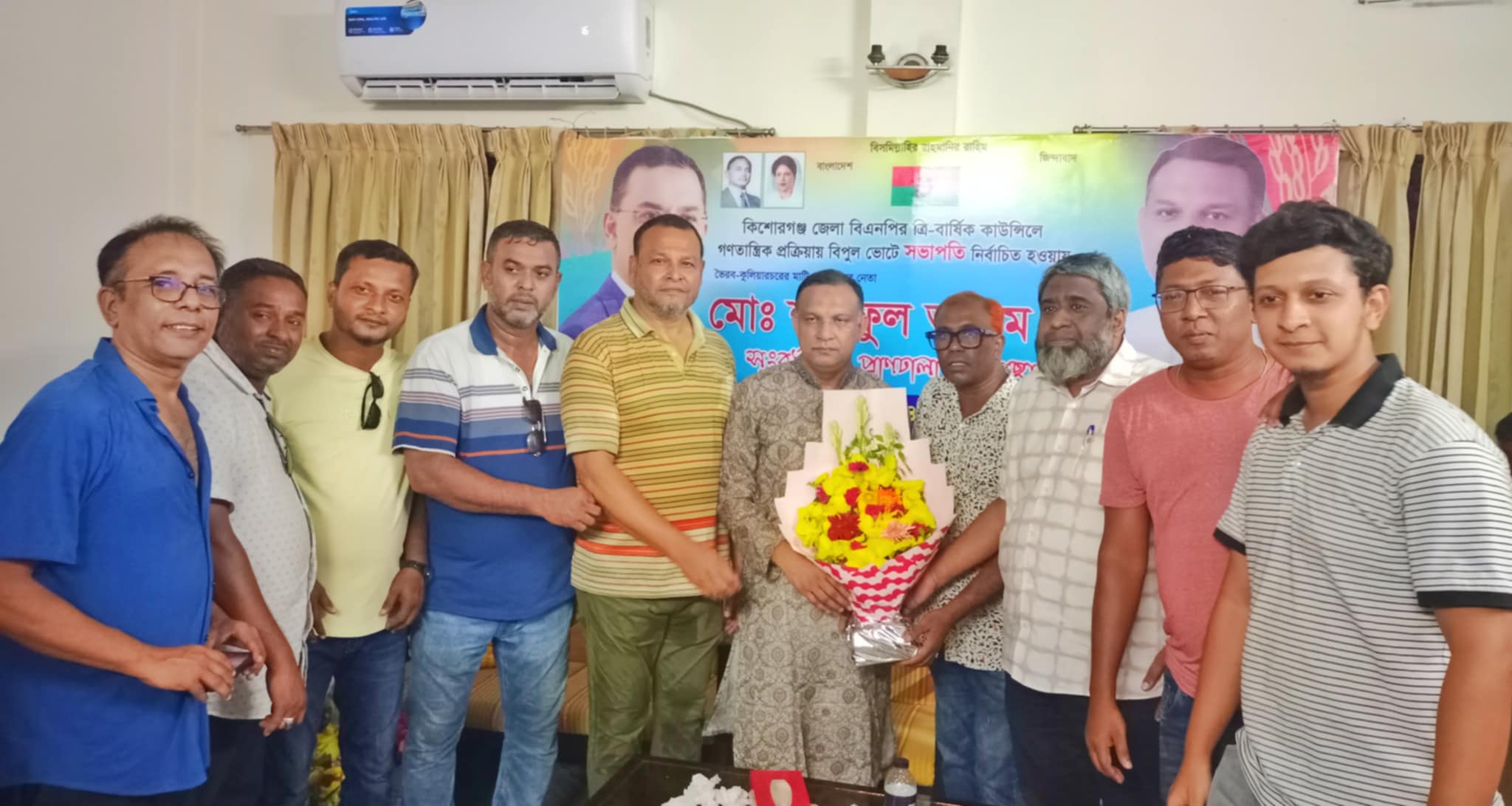 কিশোরগঞ্জ জেলা বিএনপির সভাপতি  শরীফুল আলমকে নিসচা ভৈরব শাখার পক্ষ থেকে ফুলেল শুভেচ্ছা প্রদান করছেন নিসচা সভাপতি ও সম্পাদক